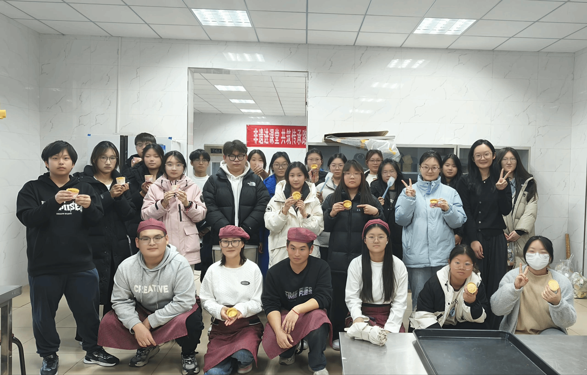 活动依托学院特色学生社团“食艺社”的专业力量,由专业教师牵头,社员们热情参与。筹备阶段,支部党员与社团骨干细致调研,精心挑选了低糖健康、口感丰富的糕点配方。活动现场,师生们充分发挥专业特长,从精确称量原料、细心调和面团,到巧妙塑形、精准控温烘烤,每一个环节都凝聚着专注与用心。当烤箱散发出阵阵诱人的麦香与甜香,当一枚枚金黄精致、点缀巧思的糕点新鲜出炉,参与制作的师生脸上洋溢着期待的喜悦。24食检4班郭鑫彤一边细心包装,一边说:“想到老师们忙碌的身影和同学们期末复习的辛苦,我们就想用所学专业,做点实实在在能甜到心里去的事。”