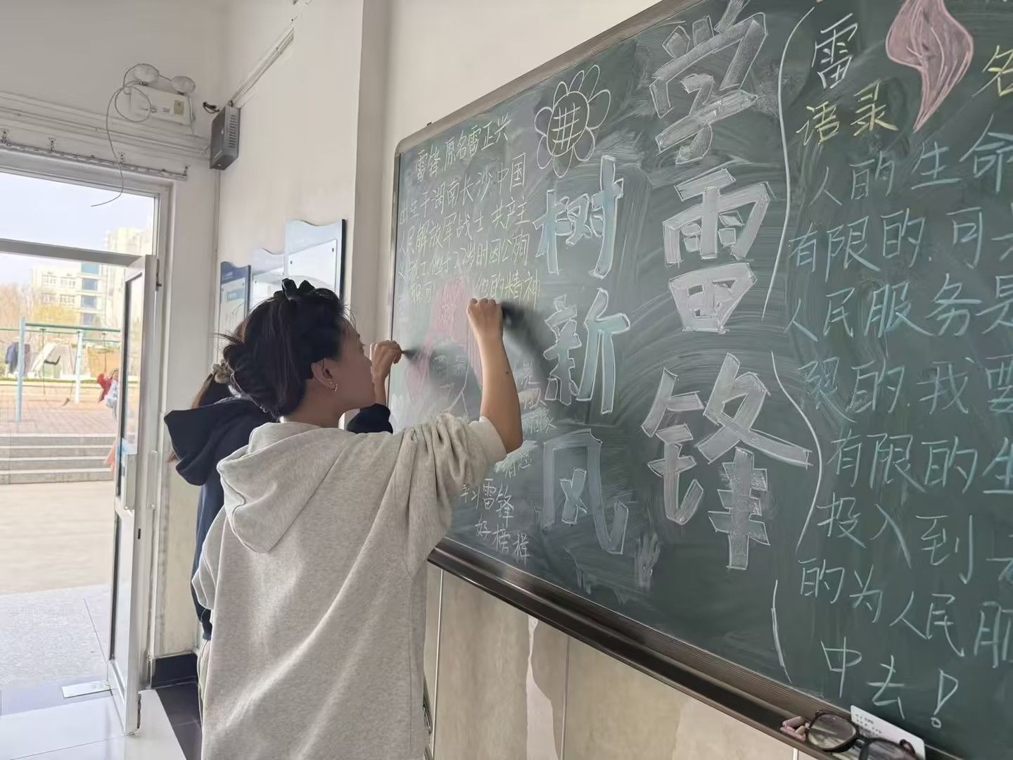 此外,志愿者们还在宿舍楼内开展“学雷锋 树新风”主题板报创作活动。大家以黑板为载体,精心设计版面,用粉笔书写雷锋生平事迹、摘抄“人的生命是有限的,可是为人民服务是无限的”等经典语录,搭配简洁生动的图案,将雷锋精神具象化呈现。板报不仅成为宿舍楼道里的一道亮丽风景,更让雷锋精神在朝夕相处的社区环境中潜移默化地浸润学子心灵,引导大家自觉向榜样看齐。