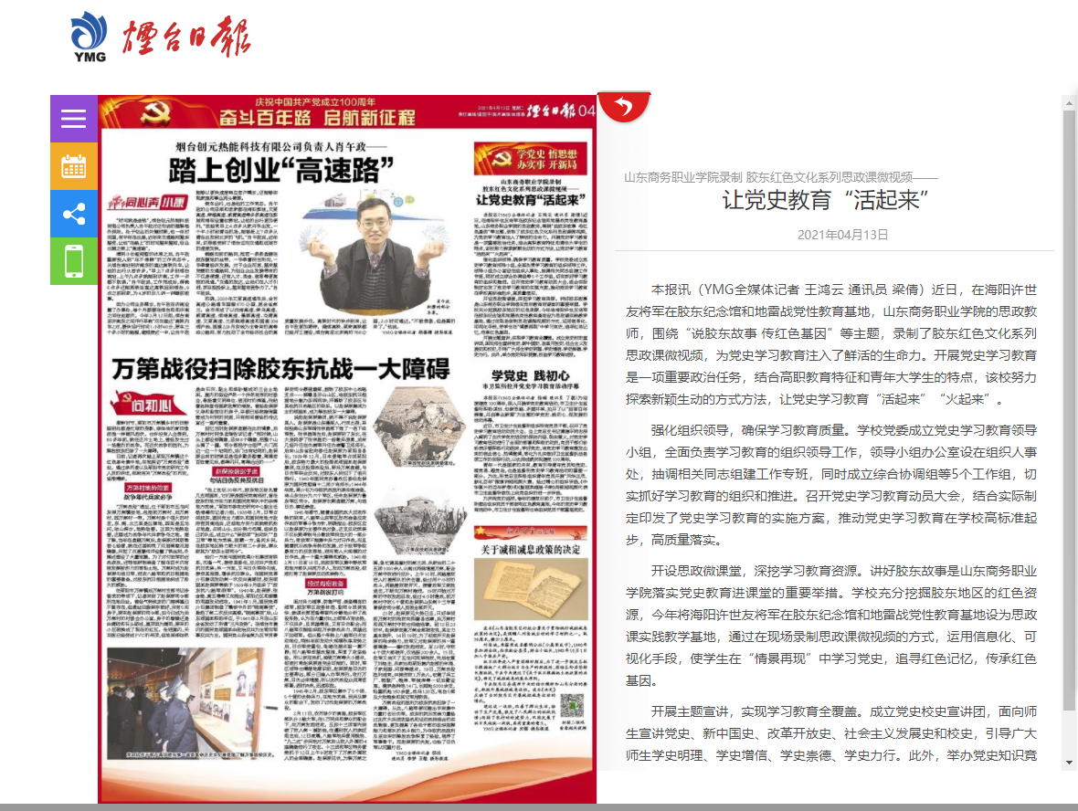 本报讯(YMG全媒体记者 王鸿云 通讯员 梁倩)近日,在海阳许世友将军在胶东纪念馆和地雷战党性教育基地,山东商务职业学院的思政教师,围绕“说胶东故事 传红色基因”等主题,录制了胶东红色文化系列思政课微视频,为党史学习教育注入了鲜活的生命力。开展党史学习教育是一项重要政治任务,结合高职教育特征和青年大学生的特点,该校努力探索新颖生动的方式方法,让党史学习教育“活起来”“火起来”。