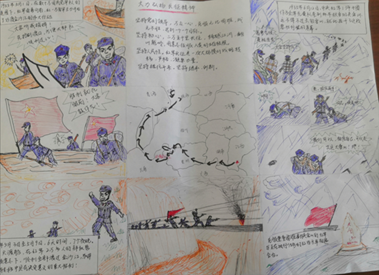 在活动开展前期围绕长征开展专题教学,让学生深刻体会到中国共产党领导中国工农红军完成震惊世界的长征,是一次惊天动地的革命壮举,是中国共产党和红军谱写的壮丽史诗,是中华民族伟大复兴历史进程中的巍峨丰碑。红军长征创造了气吞山河的人间奇迹,谱写了中国革命史的光辉篇章,奠定了中国革命胜利前进的重要基础。同学们在此基础上认真思考创作,主题突出,一幅幅作品生动地再现了红军长征翻雪山、过草地、飞越大渡河的场景,让人心中不免又想起了长征二万五千里的艰辛历程。作品也展示了当代大学生对于长征精神的理解与认同。