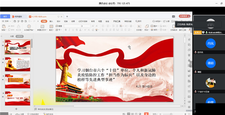 三学三谈促发展。4月23日下午,在支部党员大会学习之后,党小组组长组织召开了党小组会,会上大家从烟台市六个“十佳”单位个人、新冠肺炎疫情防控工作“担当作为标兵”事迹以及身边的榜样等先进典型事迹三个方面进行了认真深入的学习。