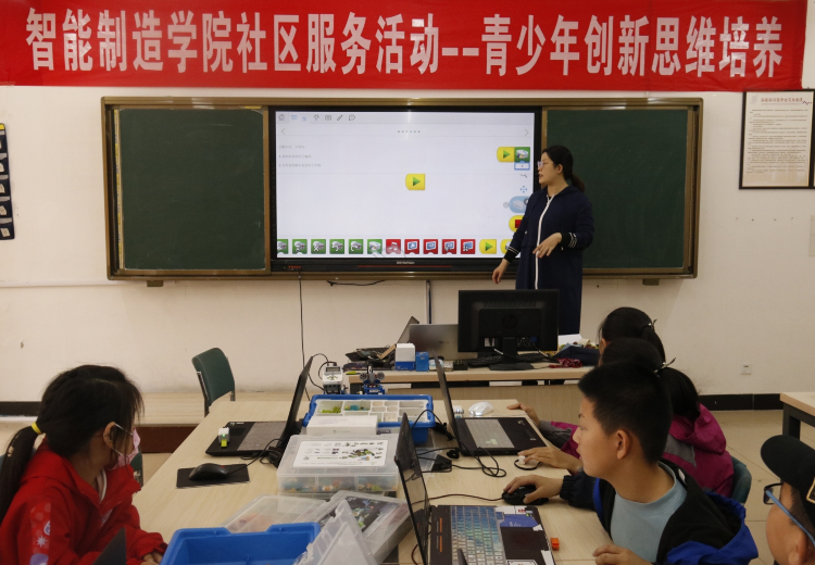 青少年创新思维培养项目作为智能制造学院2020年烟台校地融合发展项目的子目标,旨在发扬学校的资源优势、人才优势和成果优势等得天独厚的条件,为社区青少年创新能力培养提供全方位支持。培训以建立认知和树立创新意识为主,进行简单机电产品介绍与应用,让孩子们初步建立创新思维,培养其动手能力和创新能力。与老师们日常教学不同的是,青少年创新思维培养项目的教学难点是如何提高学龄前组儿童的上课专注度,为了解决这个难题,智能制造学院分工会成立志愿服务小组,从心理分析及正向激励着手,协助培训教师做好教学管理,激发孩子们浓厚兴趣,鼓励孩子们认真学习,促使培训达到预期效果。