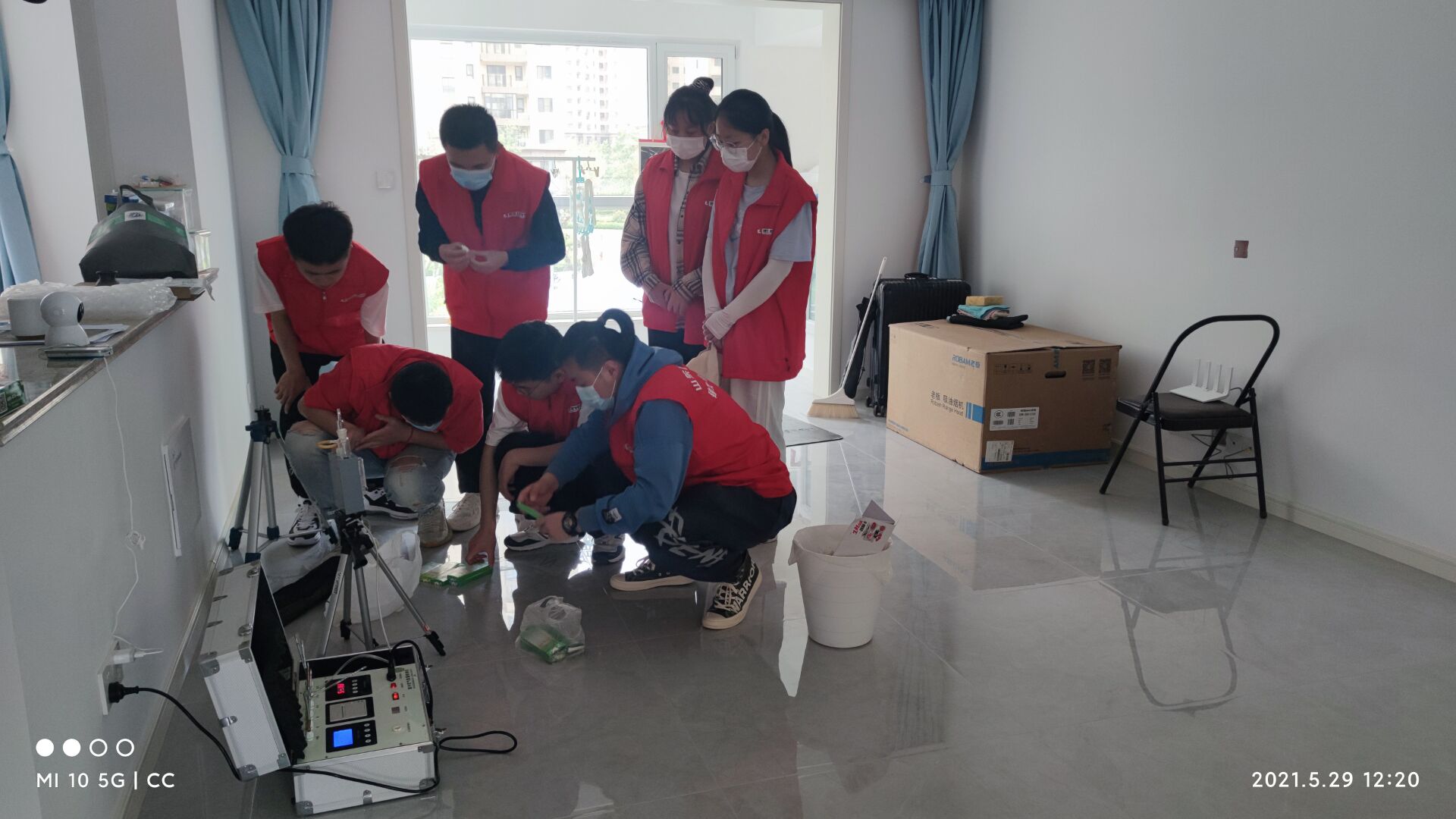 本站讯 为弘扬伟大抗疫精神,深入开展新时代爱国卫生运动,引导青年学生积极投身志愿服务行列,在学院开展“2021年职业教育活动周”之际,建筑工程学院教师党支部联合建筑装饰工程技术专业,于5月29日,来到海兴社区为社区居民提供新居室内空气质量检测和污染防治咨询服务,并着力在疫情防控、专业支撑等方面建立长效服务机制。本次活动由建筑装饰专业社会实践服务队承办。