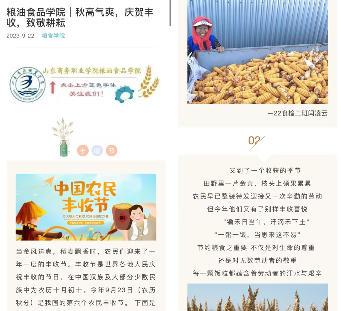 欢庆丰收,晒晒家乡农产品。金秋九月,田野飘香,田间地头到处都是繁忙的景象。为庆祝“中国农民丰收节”,商务粮苑公众号展示出同学们家乡丰收的图片。除了金灿灿的麦田,“干果之王”板栗奏响了丰收乐章,小枣也在收获忙,还有葡萄架上已经熟透的葡萄。公众号汇聚了齐鲁大地的丰收场景,学生也随着图片享受着丰收的喜悦。