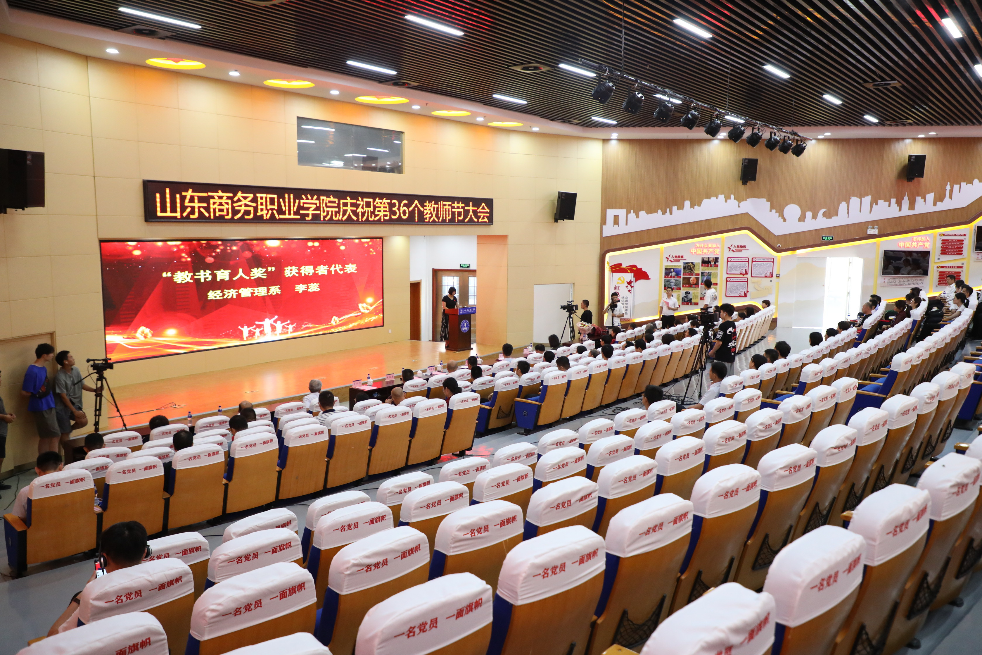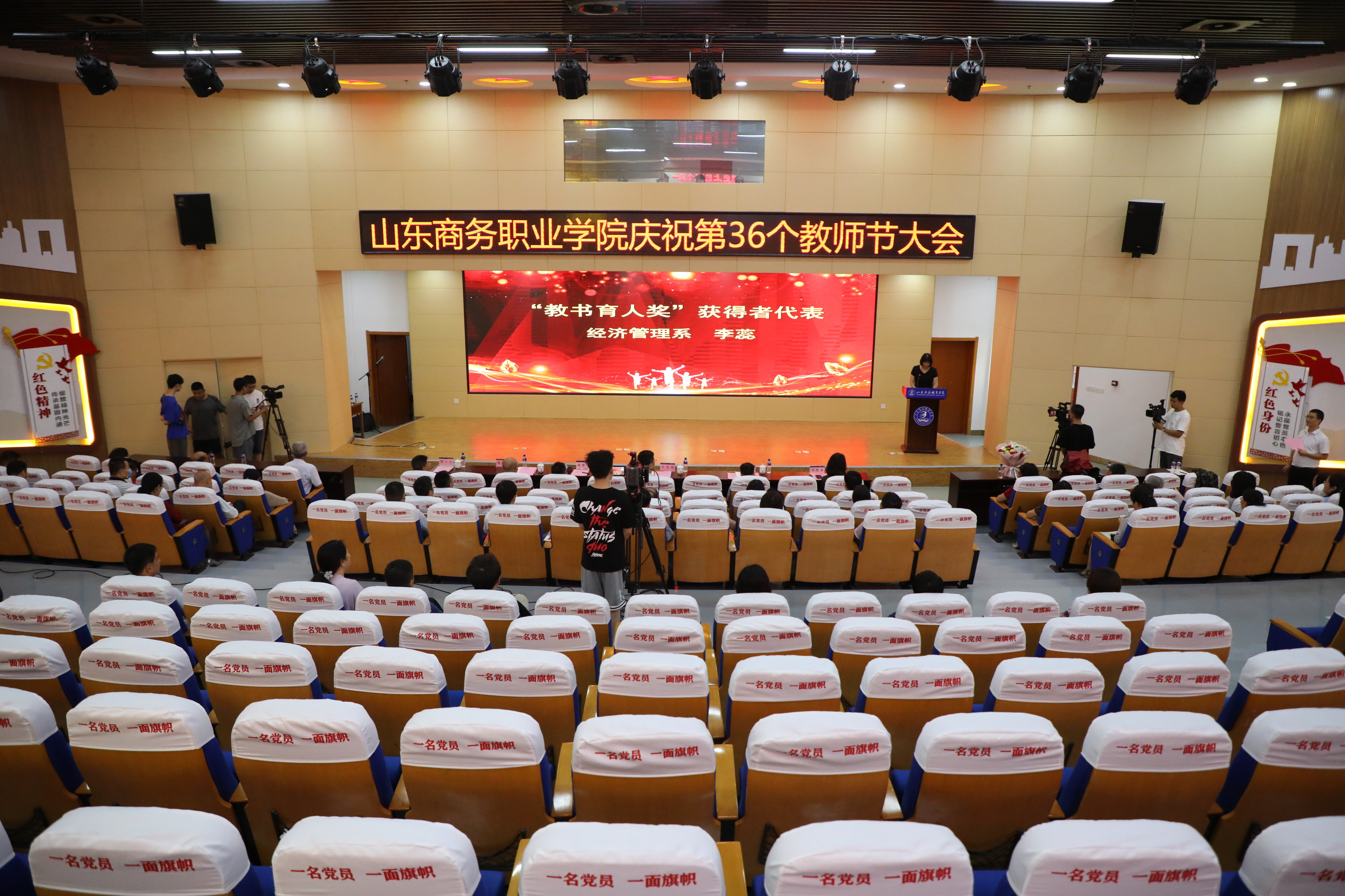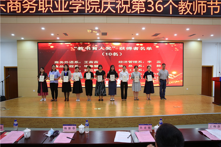 本站讯 9月10日下午,山东商务职业学院庆祝第36个教师节大会在党性教育基地举行。党委书记耿建敏,党委副书记、院长杨新春,党委副书记刘艳蔚,党委委员、副院长陶传蔚,党委委员、纪委书记王伟存,党委委员、副院长张云生出席大会。学校各处室、系部党政负责人,2020年荣休教职工代表、受表彰教师、新入职教师参加会议。各单位教职工通过网络形式收看了大会直播。会议由刘艳蔚主持。