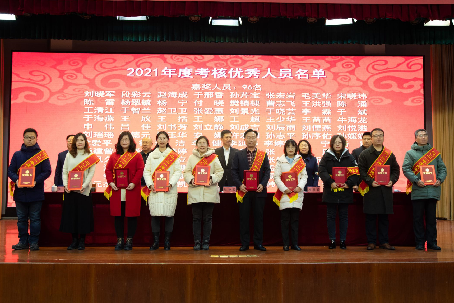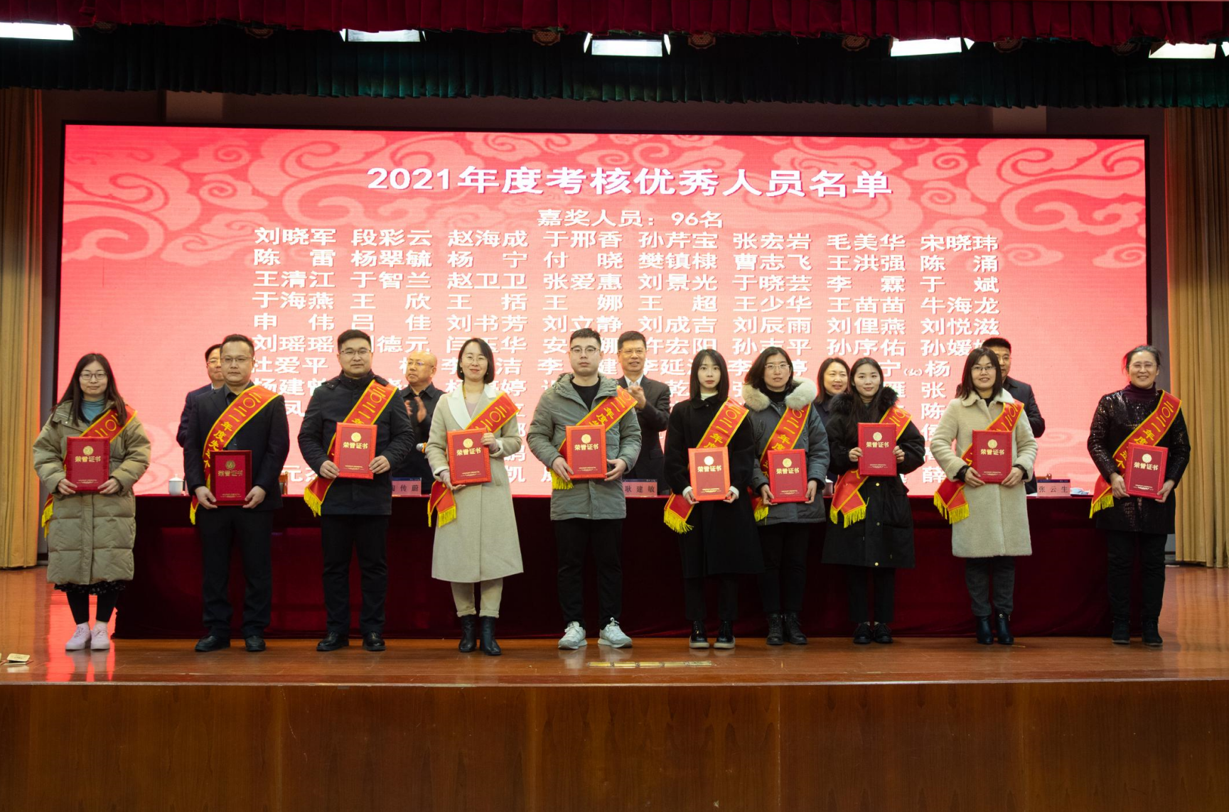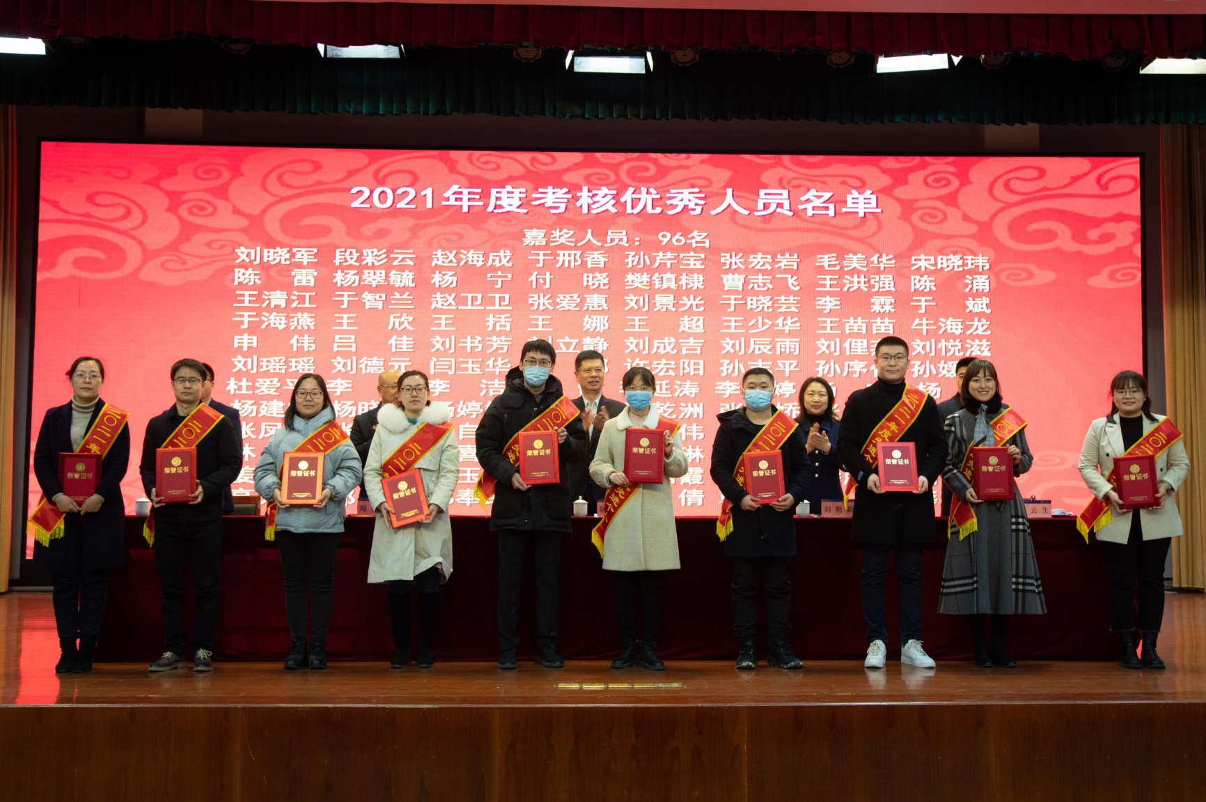 本站讯 3月1日下午,我校组织召开2022年工作动员大会。会议深入贯彻习近平新时代中国特色社会主义思想,贯彻落实全省2022年工作动员大会精神,认真总结2021年学校工作,对过去一年为学校高质量发展做出突出贡献的集体和个人进行了表彰,并全面部署2022年学校改革发展的各项任务。学校领导班子成员出席会议,党委书记耿建敏作大会讲话,党委副书记刘艳蔚主持会议。