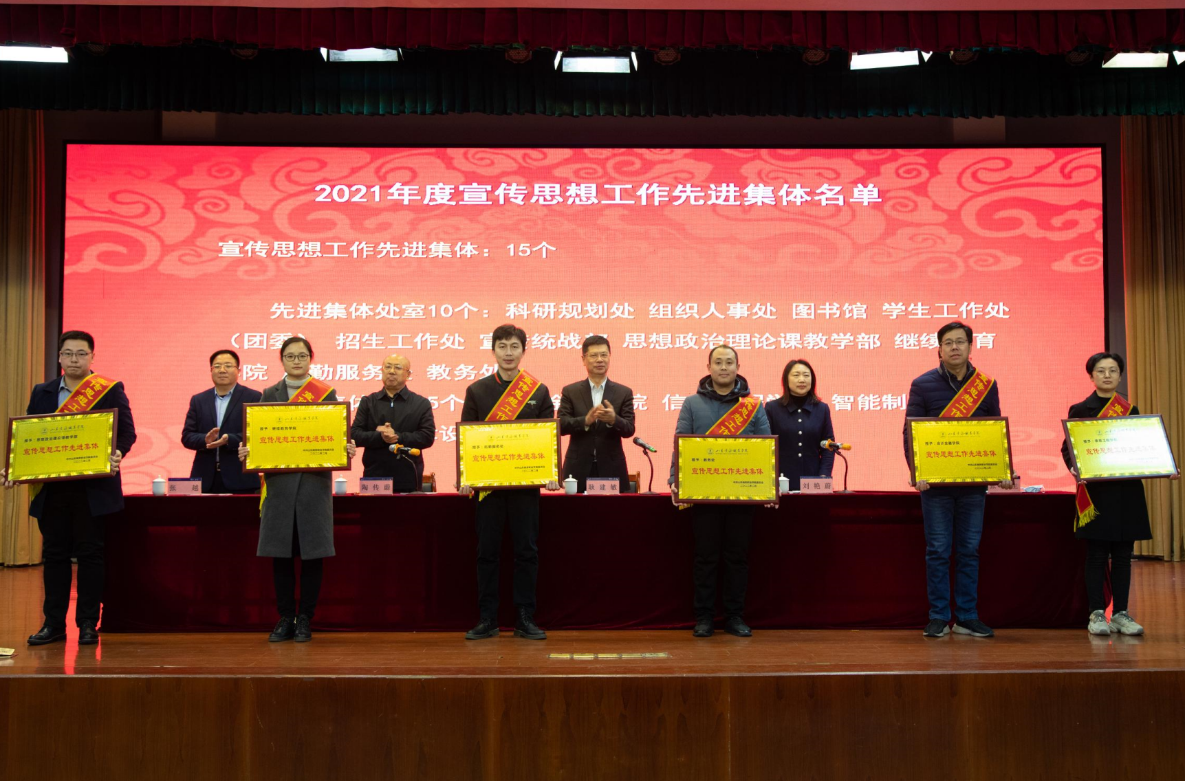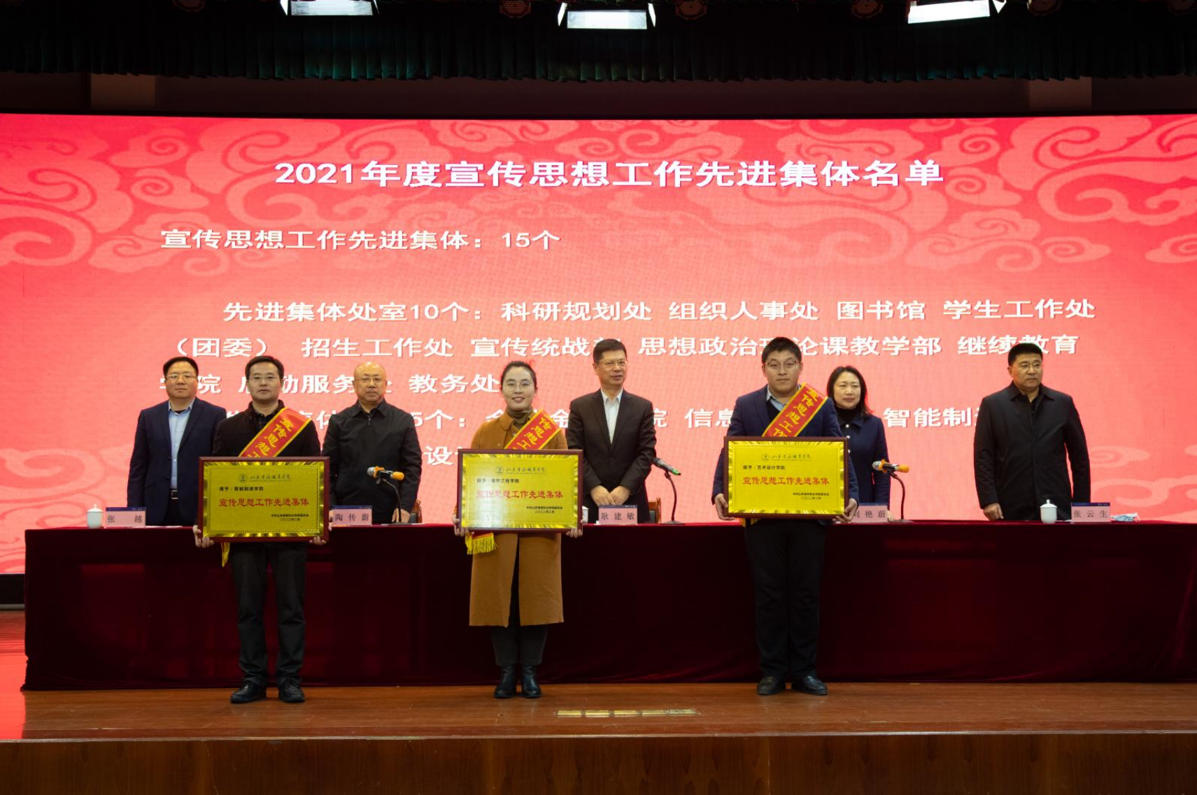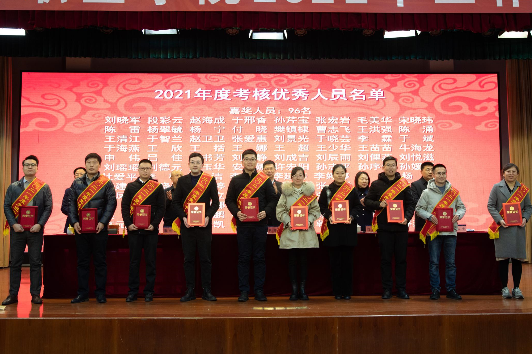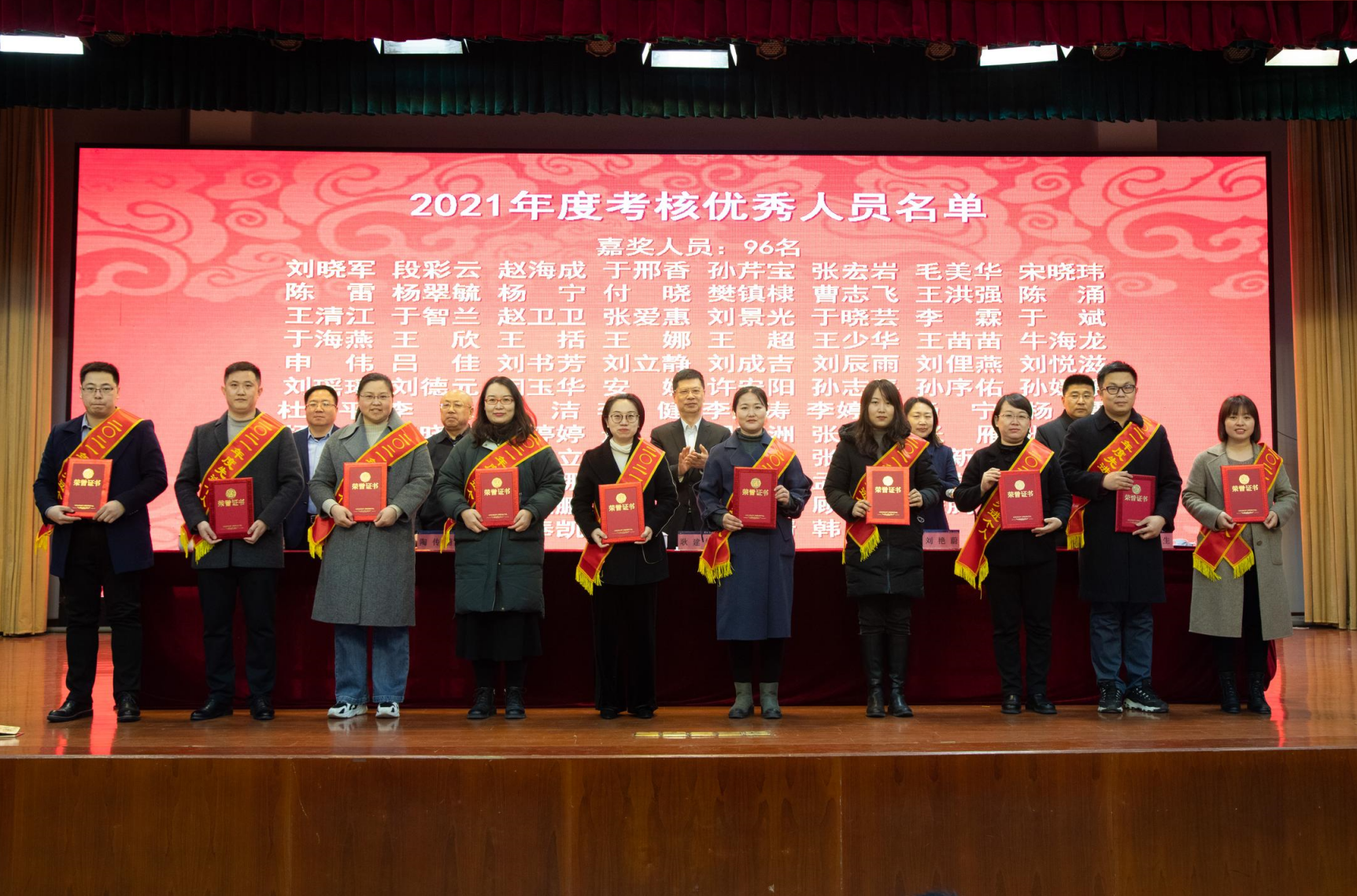 本站讯 3月1日下午,我校组织召开2022年工作动员大会。会议深入贯彻习近平新时代中国特色社会主义思想,贯彻落实全省2022年工作动员大会精神,认真总结2021年学校工作,对过去一年为学校高质量发展做出突出贡献的集体和个人进行了表彰,并全面部署2022年学校改革发展的各项任务。学校领导班子成员出席会议,党委书记耿建敏作大会讲话,党委副书记刘艳蔚主持会议。