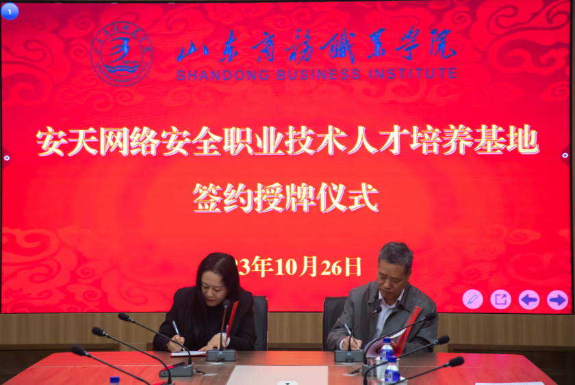 会上,孙云茂和肖新光代表校企双方为安天网络安全职业技术人才培养基地揭牌;王发明和吴菁代表校企双方签约。