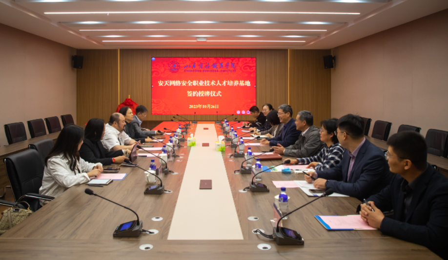 本站讯 10月26日下午,安天网络安全职业技术人才培养基地签约授牌仪式在我校办公楼一楼会议室举行。烟台市委常委、宣传部部长、教育工委书记吕波,烟台市委宣传部副部长、网信办主任王洪青,全国政协委员、安天科技集团党委书记、董事长肖新光,安天科技集团副总裁吴菁,安天科技集团校企合作负责人吴晶,黑龙江省数字安全运营有限公司首席运营官余珊珊,我校党委书记孙云茂,党委副书记、校长王发明出席会议。烟台市相关领导,我校信息工程学院、教务处、校企合作与就业工作处等相关单位负责人参加活动。