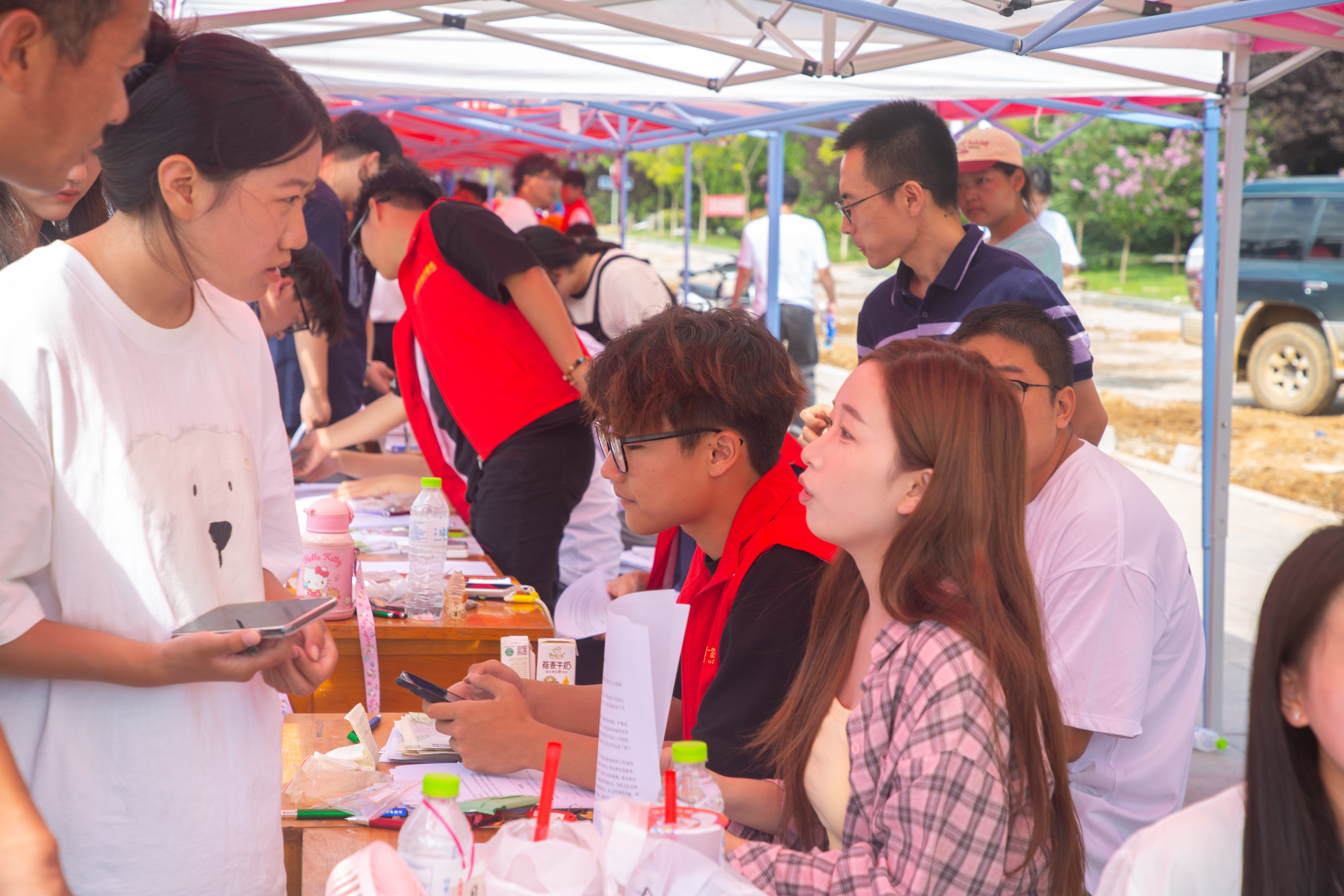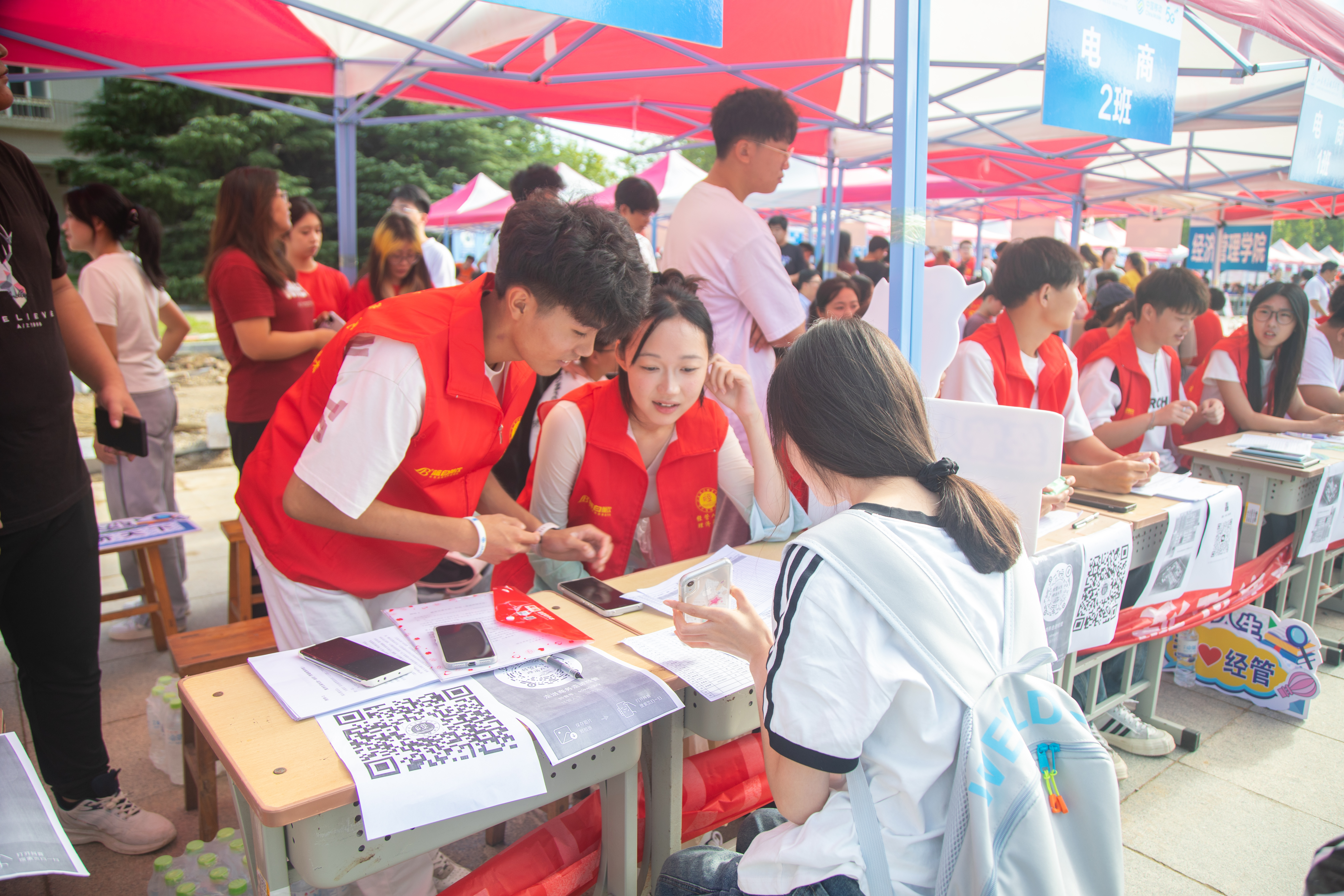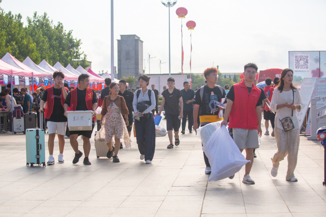 迎新现场,拱门矗立、横幅高挂、彩旗飘扬、锣鼓阵阵,指示牌随处可见,处处展示着喜庆与热情,洋溢着浓厚的迎新氛围。校园里随处可见身着各色“马甲”的志愿者,从注册报到、答疑解惑、耐心指引到行李搬运、物资领取、宿舍安排,志愿者们用心用情迎接新生到“家”。各处室、院部在现场设立服务台,为新生提供绿色通道、学籍、医疗、生活等方面的咨询与保障服务,同时通过心理加油站、非遗作品展等活动展示学校及学院特色,引得众多新生和家长驻足观看。中心大道上精心设计的的迎新展板,为新同学留下最美初印象,同学们纷纷在展板前留下真诚的笑脸,用镜头定格难忘瞬间。