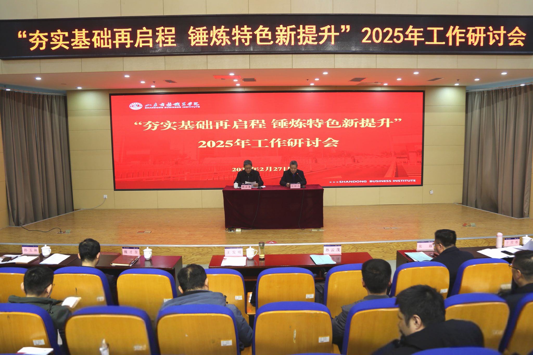 本站讯 风劲扬帆起,实干绘宏图。2月27日,我校召开2025年工作研讨会,围绕“夯实基础再启程,锤炼特色新提升”这一主题,聚焦学校发展核心议题,总结经验、分析形势,统一思想、明确任务,为实现高质量新发展凝聚智慧和力量。党委书记孙云茂作动员讲话,深刻分析学校发展面临的形势机遇,指明全年和未来一个时期的重点任务和工作方向,对提升研讨质效、推动工作落实提出更高要求。全体党委委员出席会议。学校正科级及以上干部、各专业带头人和全体辅导员参加会议。会议由党委副书记、校长王发明主持。