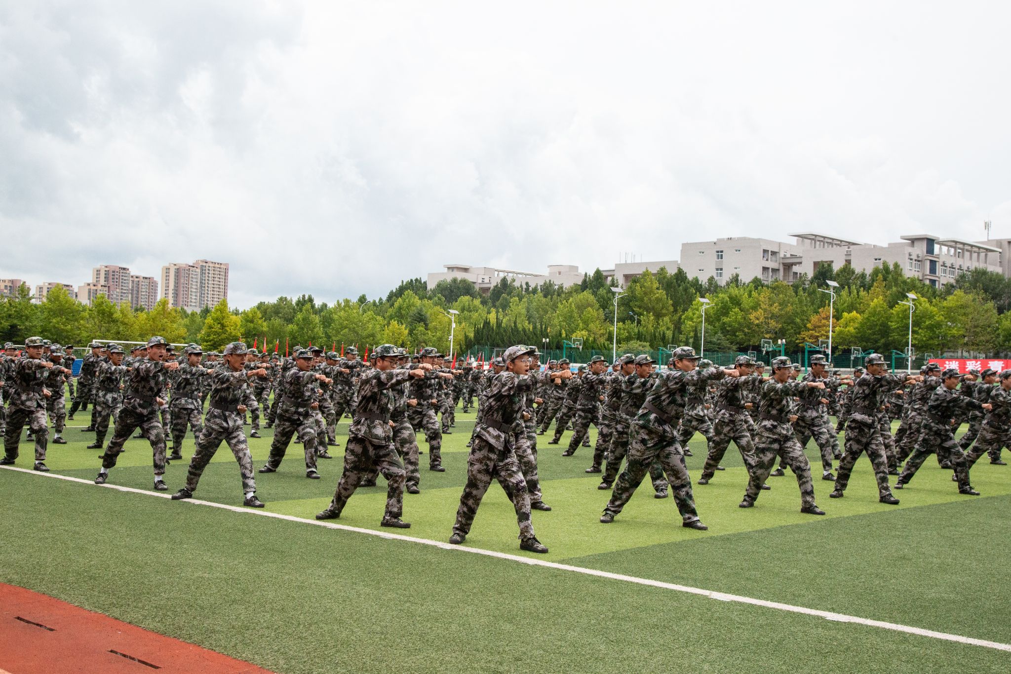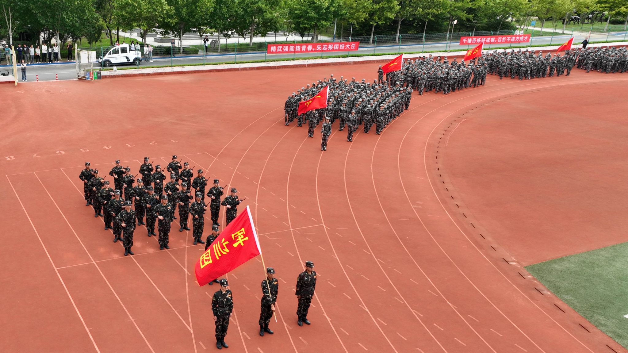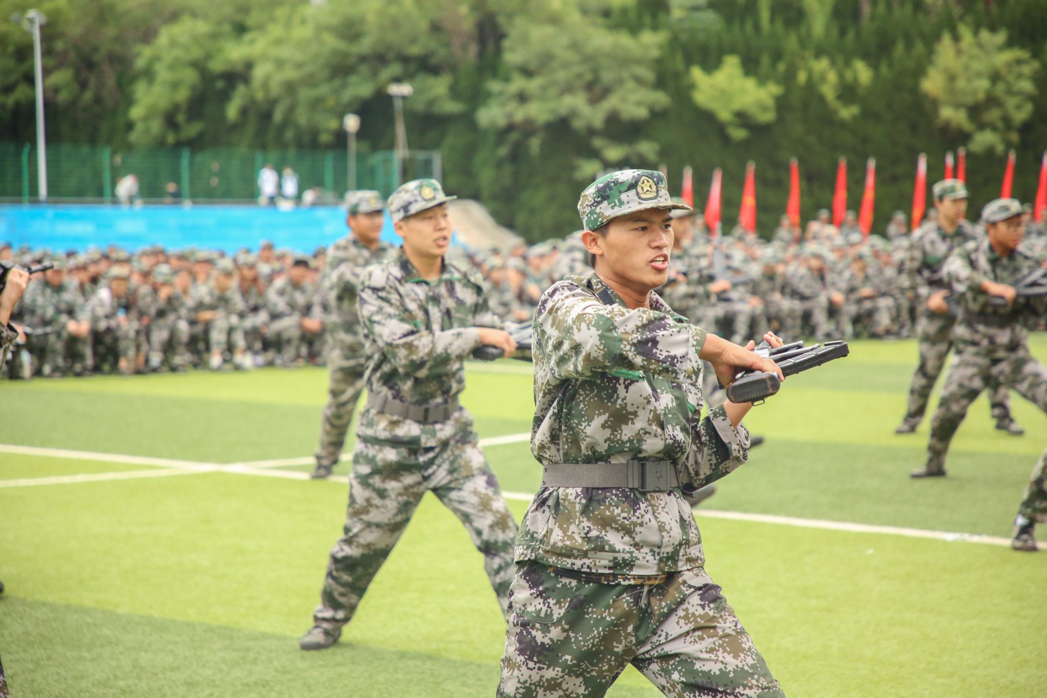 国歌奏响,红旗飘扬,全体师生肃立行注目礼,大会在雄壮的国歌声中拉开序幕。2025级新生军训团军事技能汇报随之开始,8个方队依次通过主席台,展现了商务学子的蓬勃朝气和昂扬锐气。在特色展示环节中,3个方队依次进行军体拳、匕首操、刺杀操等成果展示。整齐标准的动作、振奋昂扬的面貌、青春活力的姿态,赢得了师生的阵阵掌声。