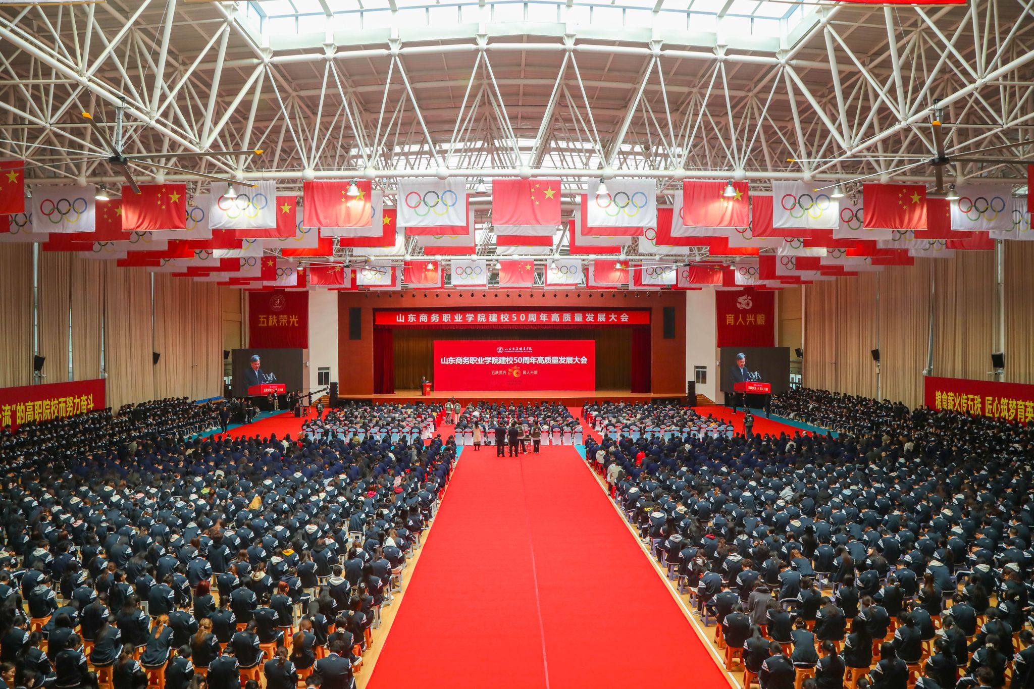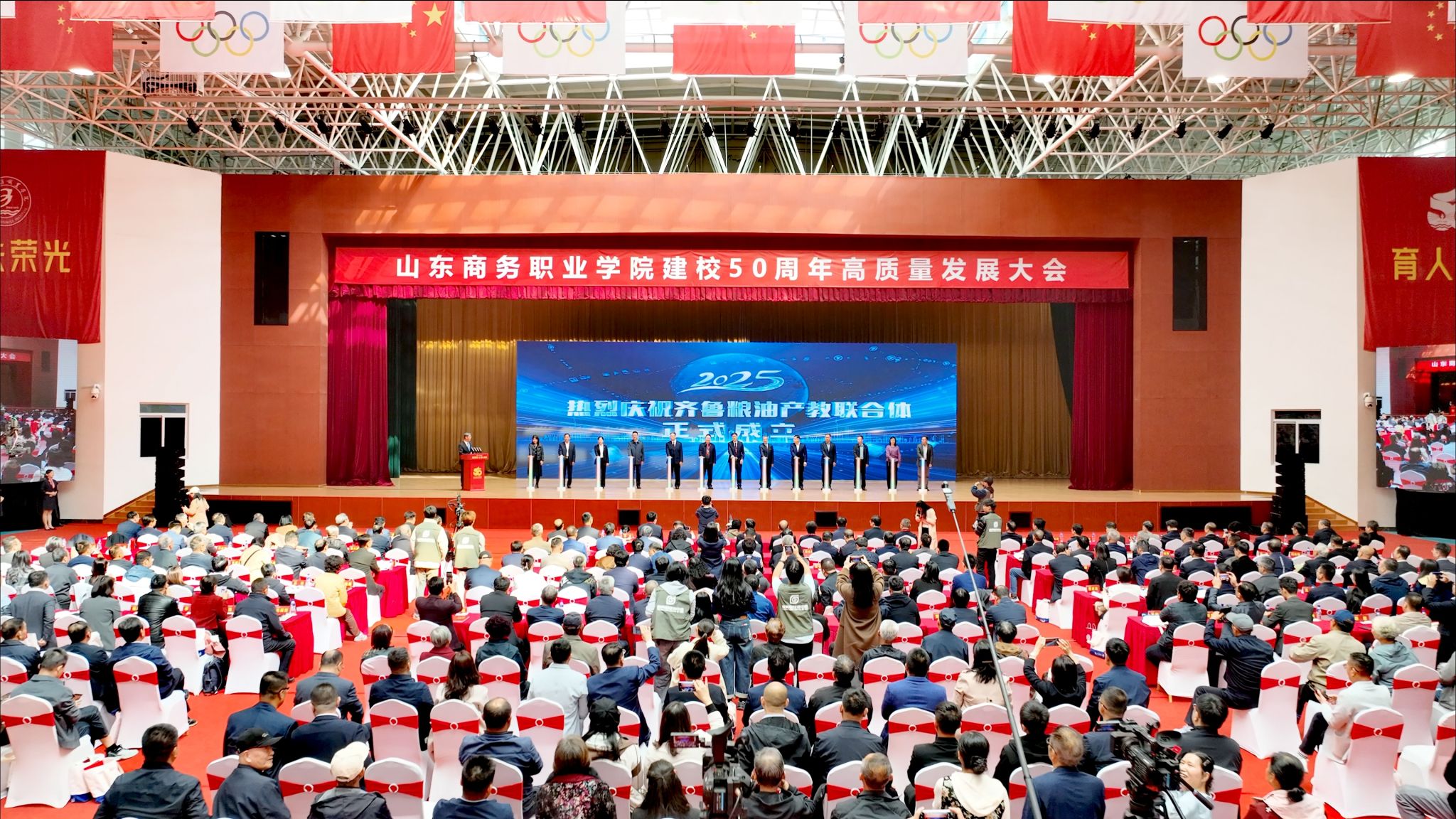 本站讯 五秩荣光,育人兴粮。10月18日上午9时,学校建校50周年高质量发展大会在体育馆隆重举行。烟台市人民政府副市长林钰涛,山东省教育厅二级巡视员管恩文,山东省粮食和物资储备局党组书记、局长常绪扩等领导出席并致辞。大会由学校党委书记孙云茂主持,学校党委副书记、校长王发明作学校事业高质量发展报告。