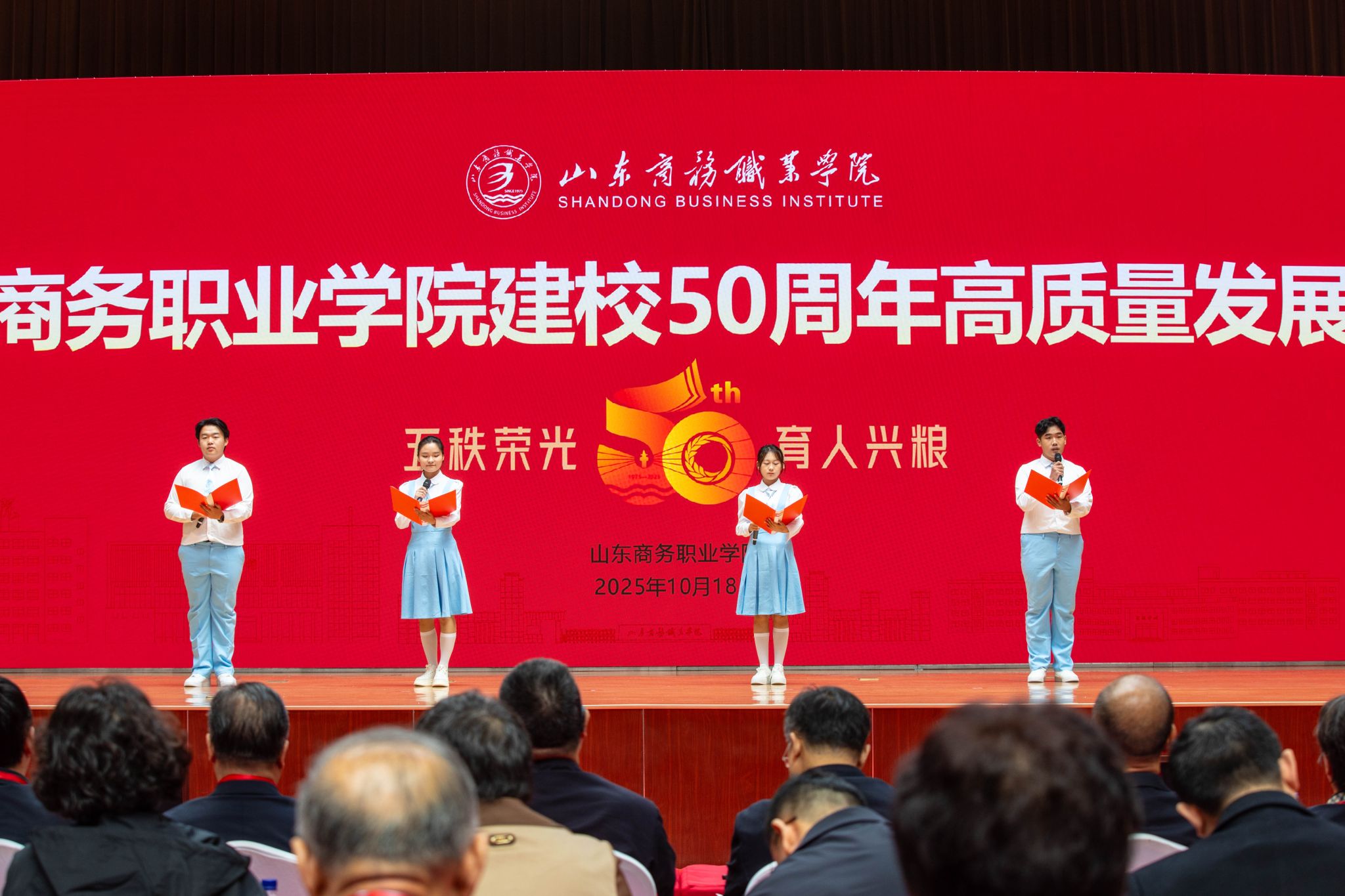 教师代表全国技术能手、粮油食品学院院长、教授黎海红,校友代表中国农业发展银行原副行长、北京校友会名誉会长、77级财会统计专业姚瑞坤先后发言,表示会继续弘扬山东商务职院精神,赓续优良传统,锐意进取,开拓创新,在新时代新征程上开创学校新辉煌。学生代表为校庆大会献词,表达了对学校的美好祝愿和“强国有我”的青春誓言。