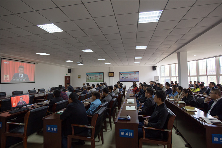 上午9时,在学校行政楼一楼学习中心,学校党委中心组全体成员和全校副科级以上干部欢聚一堂,认真观看十九大开幕会电视直播,聆听习近平总书记的报告。收看收听报告的过程中,每名同志都聚精会神,不少同志边看边记录,不时为习近平总书记的报告所打动,所鼓舞。