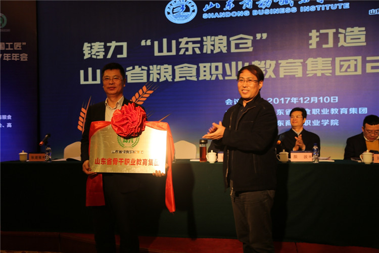 山东省教育厅职业教育处调研员孟令君为山东省粮食职教集团颁发“山东省骨干职业教育集团”奖牌。
