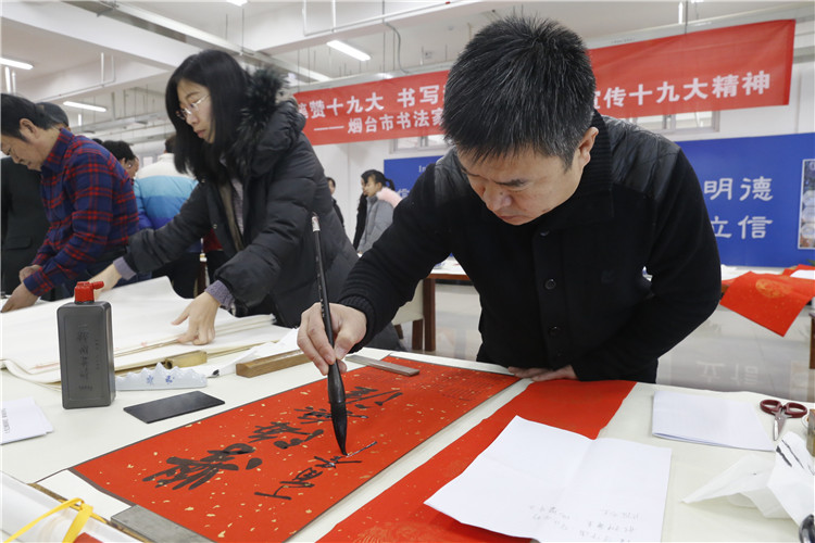 本站讯 2018年1月5日上午10时,我校图书馆二楼大厅翰墨飘香、丹青溢彩。一场以“笔赞十九大,书写新时代”为主题的书法活动在此举行。