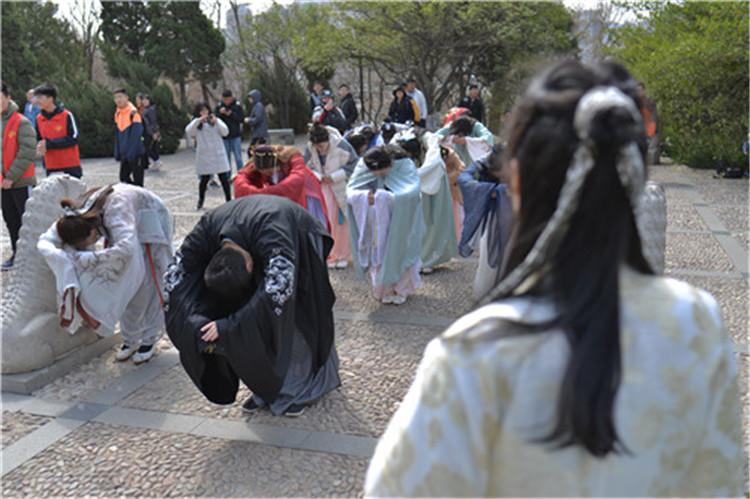 本站讯 4月17日,春天里的山东商务职业学院校园花团锦簇、弥漫花香。不过比花儿更吸引人的是一群正值妙龄的姑娘。她们身着不同形制的汉服,梳着结鬟,衣袂飘飘的走在师生中间。原来,这是该校青青子衿汉服文化社团在为农历三月三(4月18日)上巳节的宣传进行拍摄。