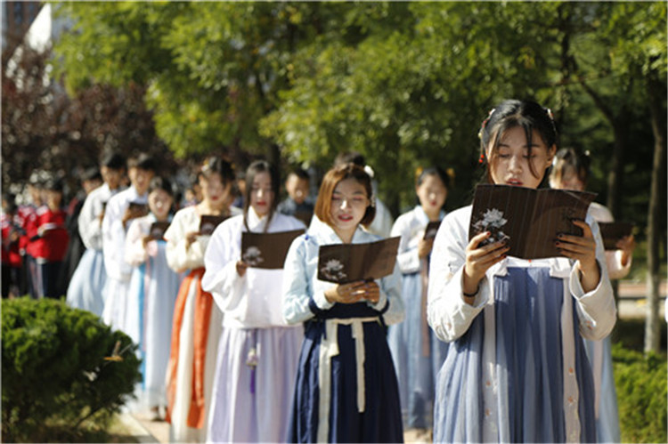 据了解,该校青青子衿汉服文化社团于2015年正式成立,短短不到三年,该社团已由最初几个人发展成为三四十人的星级社团。他们通过组织活动,身体力行地推广着传统文化。在“元宵”“清明”“端午”“中秋”“重阳”“等传统节日他们穿上传统服装,并模仿古人登高、包粽子、诵读、乞巧等活动,为同学们讲解传统文化知识。社团的表演。“每年新生军训、迎新晚会、各类晚会和日常大大小小的活动上,都会有我们的身影。”现任社长、会计系16级审计一班的刘雅萱笑着说,一年参加多少活动自己也数不清。