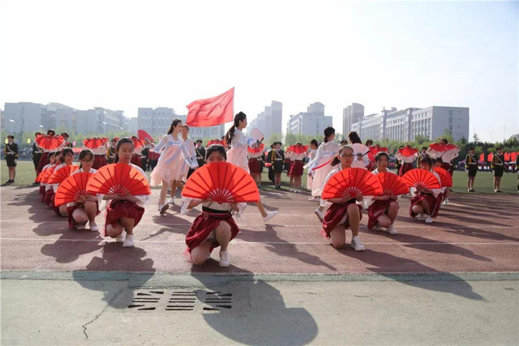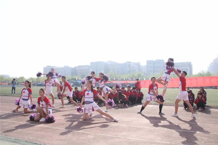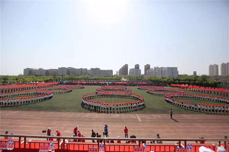 团体操表演以狮子舞开场,再现了我们商务人不屈不挠、奔腾争跃、喜气祥和的精神面貌。由信息艺术系、机电工程系、食品工程系三个系共800名同学带来的团体操表演动作整齐划一,节奏感强烈,让人眼前一亮:800名同学沐浴明媚的春光,迎着欢快的音乐,他们手持火红的扇子,奔向操场的中央,翻飞舞动的扇子抒发着生命的喜悦,舒展大方的动作洋溢着生命的欢快。运动场上,他们组成的九道方阵,恰似彩色的海洋,一个个充满青春活力的青年挥动着彩扇,熠熠生辉。表演队伍变成了大花园的图案,寓意“渊源共生,和谐共融”,预示着我们学校更加辉煌!圆中圆,大同心圆,围绕不变的中心点,串成九个同心圆,是希望、拼搏、勇气、守望,把我们的奋力拼搏的心串联在一起,串成梦想之圆。随后,表演队伍变换出“十九大”以及“S””W”的图案,寓意我们山东商务职业学院在党的十九大的光辉指引下,在学校党委的正确领导下,一定会魅力四射,奏响高职院校最强音!