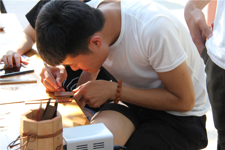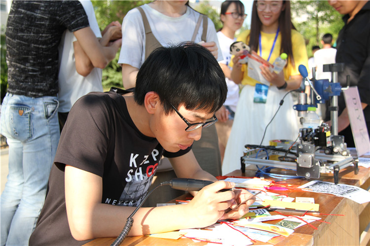 师生簇拥在“鲁班文创工作室”的摊位前,仔细观摩专业设备,详细询问设备功能,有的同学则饶有兴趣的亲手用激光雕刻机、刻刀和牙机制作书签。“我平时就喜欢收藏书签,也自己用树叶做过书签,今天有机会能用专业设备亲手雕刻一个书签感到非常兴奋,书签上有我的名字,这是我的专属书签。”17级旅管专业的刘晓宇同学激动地表示,会把书签珍藏留作纪念。