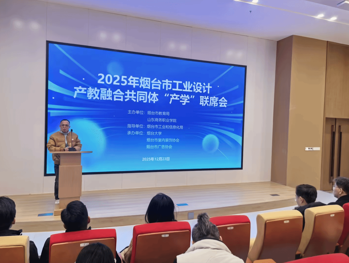 本站讯 12月23日,由艺术设计学院牵头组织的烟台市工业设计产教融合共同体“产学”联席会,在学校新教学楼报告厅召开。本次会议由烟台市教育局、山东商务职业学院主办,烟台市工业和信息化局指导,烟台大学、烟台市室内装饰协会、烟台市广告协会承办,参会企业涵盖文化传媒、信息科技、建筑装饰、家具制造等多个领域,烟台市广告协会秘书长李福玉及各企业总经理、技术总监等均到场参会。会议以“深化产学协同,共育产业人才”为核心,汇聚烟台市十余家关联企业代表与院校力量,围绕产业链发展、人才培养等关键议题展开深入交流,为2026年校企深度合作谋篇布局,取得理想成效。